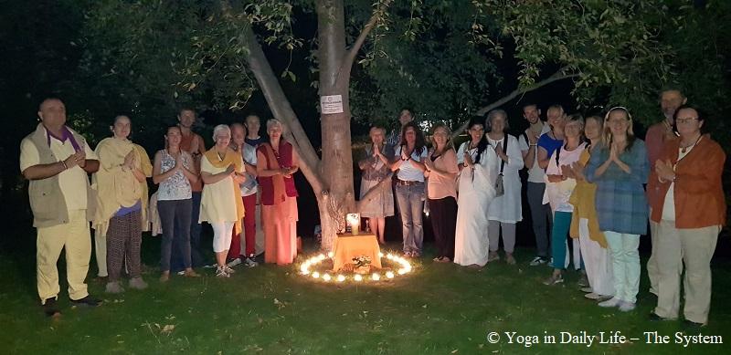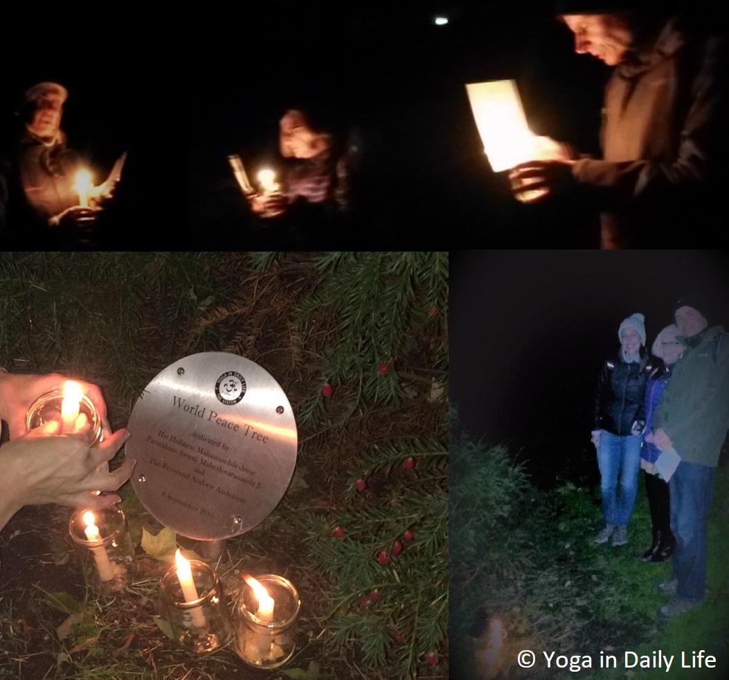In Scotland, the morning and evening classes on Friday 21 September at Mahaprabhu Deep Ashram in Edinburgh were dedicated to peace, and the evening meditation session included chanting of the traditional Vedic Peace Mantras. After class, participants shared a light supper of vegan soup and then walked together to the World Peace Tree in nearby London Road Gardens, planted by Vishwaguruji and Revd. Andrew Anderson in 2010. With lighted candles, the group made wishes for peace whilst circling the tree, and chanted the peace mantras together again, for the benefit of all living beings.