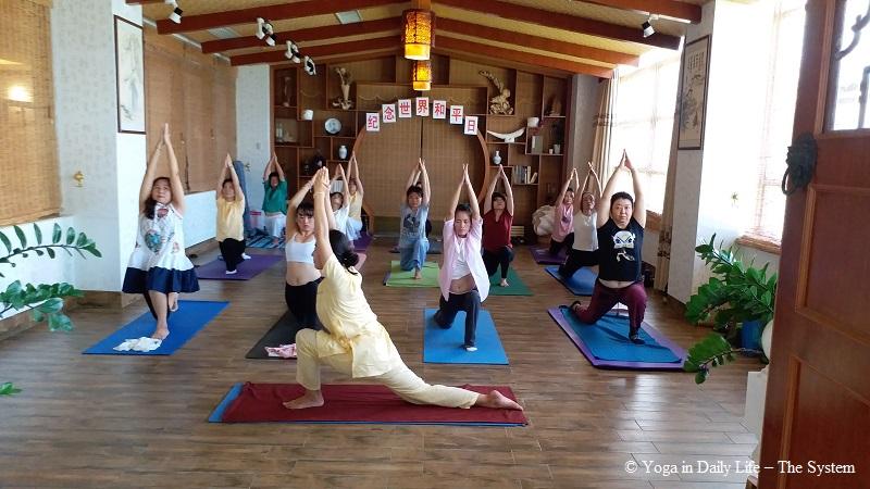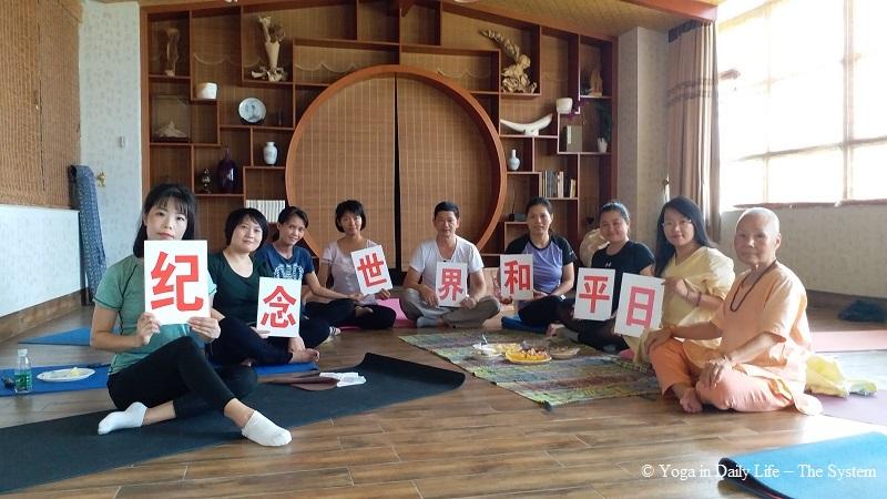 In Hainan, China, members of the YIDL community invited the public to two free yoga classes in celebration of the International Day of Peace on 21 September, where participants could experience inner peace through Yoga in Daily Life. At end of the celebration, fruits and snacks were provided to participants. The Chinese characters in the photographs translate as: "Remembering World Peace Day".