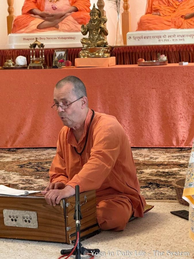 With great joy, participants sang together with Swami Gajanand the bhajan by Holy Guruji, OM Ki Racana Sari Re – expressing that everything is the creation of OM, the sound-form of the Divine (nada rupa parabrahma).