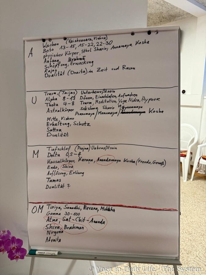 The workshop further explored the Mandukya Upanishad, which describes OM in its most comprehensive sense. OM (or AUM) encompasses time – past, present, and future – as well as the timeless fourth state of samadhi. It represents all states of consciousness – waking, dreaming and deep sleep – and the transcendental turiya, enlightenment. Thus, OM is identical with atma, and atma is identical with paramatma, expressed in the great Vedic statement (maha-vakya): ayam atma brahman – “This Atma is Brahman.”