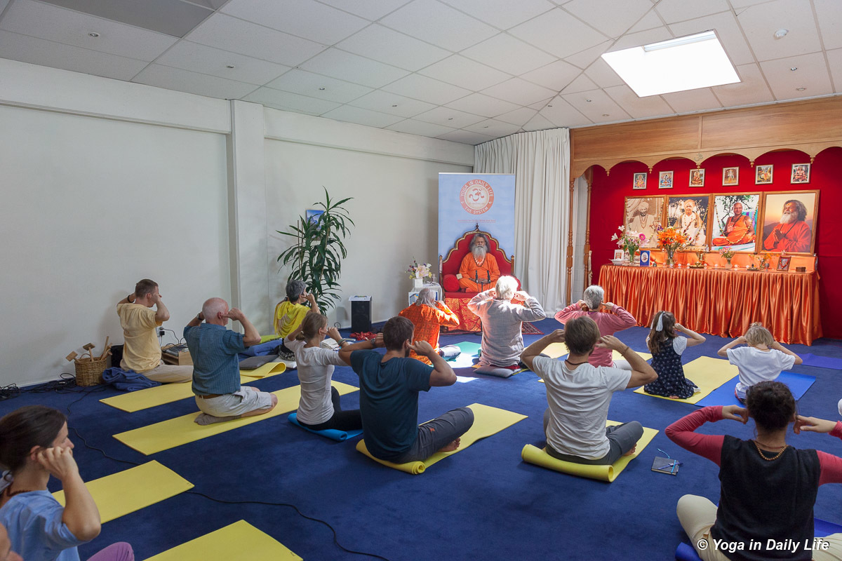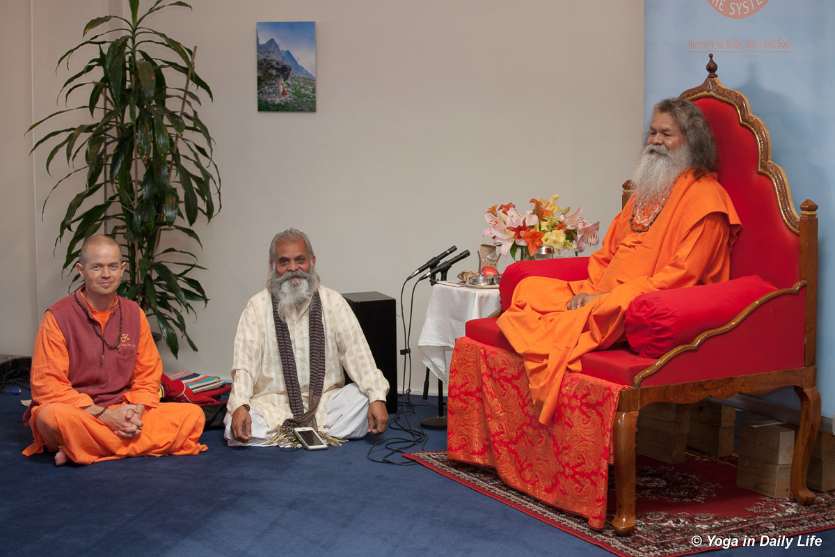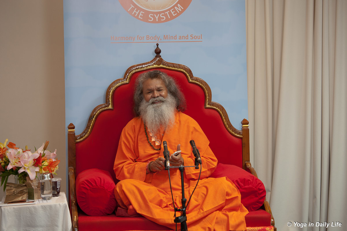Vishwaguruji gave theoretical and practical lectures and satsangs about how to manage everyday stress through using simple yogic techniques. In particular, Vishwaguruji explained the Brahmari Pranayama technique and OM chanting, and suggested to practice these on a daily basis, not just for stress management, but to prevent certain health problems.