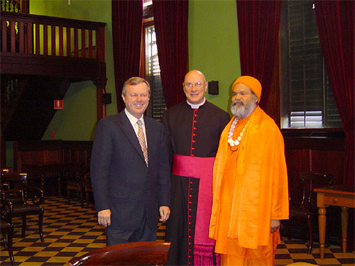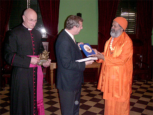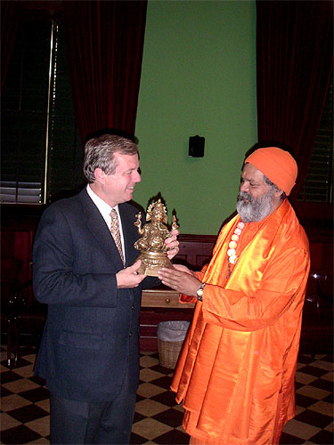 On March 25th 2004, His Holiness Vishwaguru Mahamandaleshwar Paramhans Swami Maheshwarananda Ji was invited to Parliament House by the Premier of South Australia, His Excellency Mr. Mike Rann. Two years ago, His Holiness Swamiji met Mr. Mike Rann at a multifaith gathering in Adelaide, when Mr. Rann was still an MP (minister of parliament) and at that time Swamiji prophesised that on their next meeting he would be Premier of the State. True to that prophecy Mr. Rann won the next election and since then has been a highly successful and progressive Premier in working for social justice, aboriginal rights and the environment for the state of South Australia.