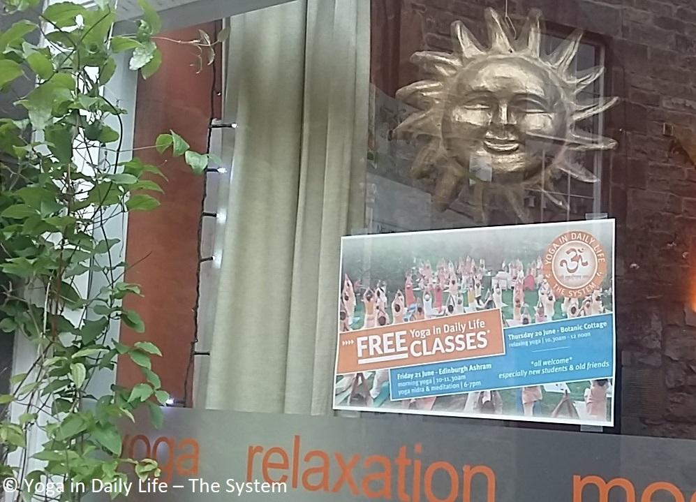 Edinburgh, Scotland – on Thursday morning a free yoga session was provided at the historic Botanic Cottage in the Royal Botanic Gardens of Edinburgh, where Vishwaguruji led a program during his visit to Scotland in September 2017. On Friday 21 June, being the northern summer solstice, surya namaskars were included in the free morning Yoga class at Mahaprabhu Deep Ashram in Edinburgh. In the evening, the free Yoga Nidra class was very well attended by many people filling the yoga room, eager to round off their busy working week with some deep relaxation, followed by vegan chai and refreshments. Students in the ashram also had the chance to write what they like about yoga on the chalkboard after class, as has become the tradition in Edinburgh in celebration of IDY each year, since 2015.