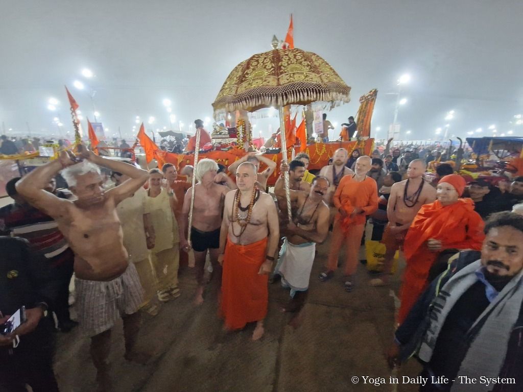 At the sacred Maha Kumbh Mela in Prayagraj, Vishwaguruji, Mahamandaleshwar Paramhans Sri Swami Maheshwarananda Ji, was represented by Mahamandaleshwar Swami Gyaneshwar Puri Ji, accompanied by sannyasis and numerous international devotees of Yoga in Daily Life.