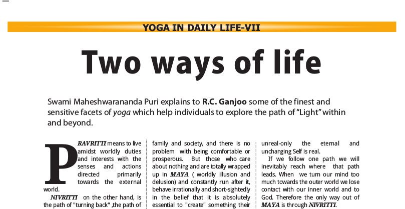 "Two ways of life" is the seventh article about Vishwaguruji's teachings that is published in India's national magazine, Power Politics.
