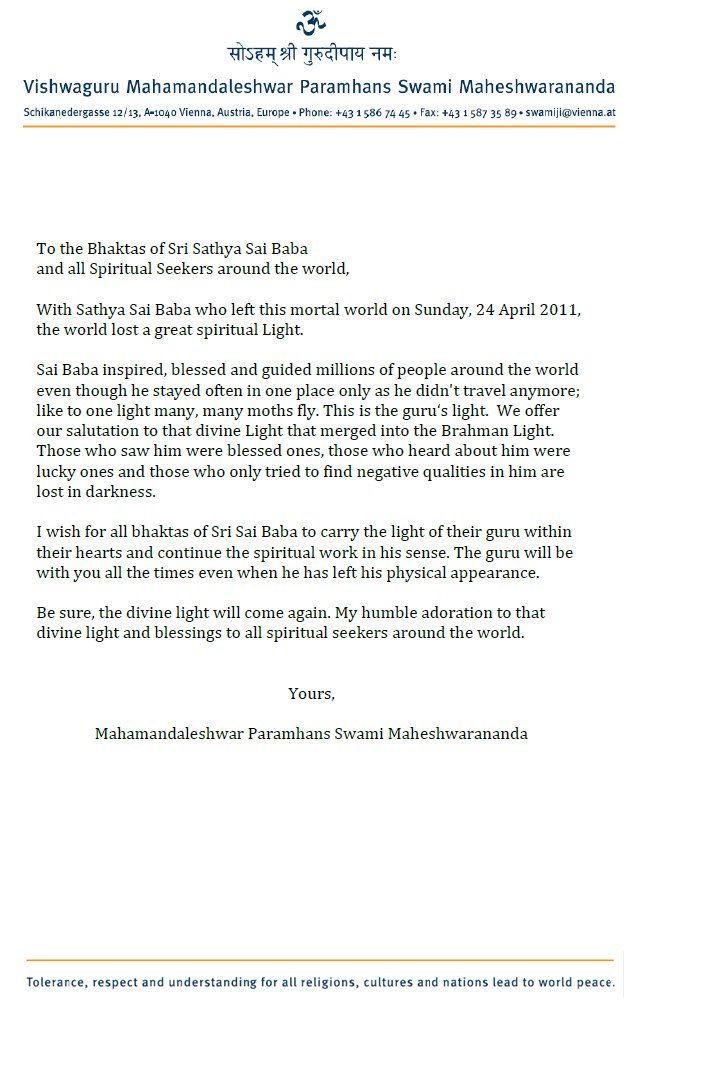 Mataji - the mother of H.H. Vishwaguru Mahamandaleshwar Paramhans Swami Maheshwarananda - left this physical world
