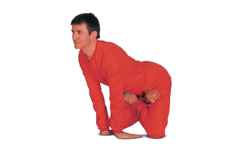 Posaďte se do padma ásany a přejděte do vzporu klečmo. Ruce si opřete před sebou o podložku, prsty jsou vytočeny vzad. Napněte břišní svaly, zatlačte lokty proti tělu a přesuňte váhu těla na nadloktí. Zvedněte kolena a bradu tak vysoko, až se tělo dostane do vodorovné polohy. Pohled směřuje dopředu. Váha těla spočívá pouze na rukou. >Dýchejte normálně a setrvejte chvíli v pozici. Pak se vraťte do výchozí polohy.