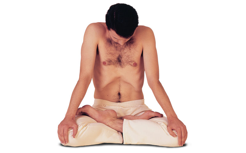 Inhale deeply and exhale fully through the mouth. >Hold the breath out. >Place the hands on the knees, raise the shoulders and tilt the upper body forward slightly, keeping the back straight. >Perform Jalandhara Bandha and concentrate on the Vishuddhi Chakra. >Perform Uddiyana Bandha and concentrate on the Manipura Chakra. >Finally, come into Mula Bandha and concentrate on the Muladhara Chakra. >Remain in this position, with all three Bandhas maintained, for as long as the breath can easily be held. >Release the Bandhas in the same sequence as they were applied. >Inhale deeply and return to the starting position. Breathing normally remain for some time in this position.