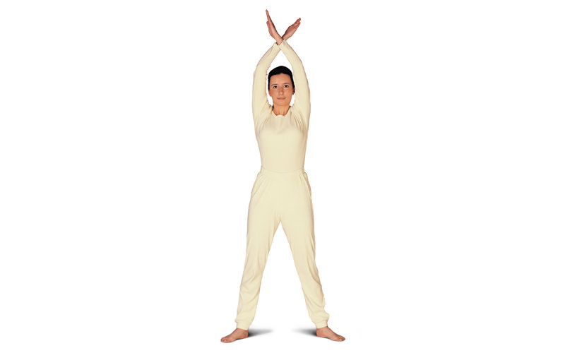 Stand with the legs slightly apart. > Inhaling raise the arms sideways and cross them above the head. > Exhaling lower the arms beside the body. > Cross the arms in such a way that, alternately, the left arm and then the right arm is in front. After the exercise return to the starting position.