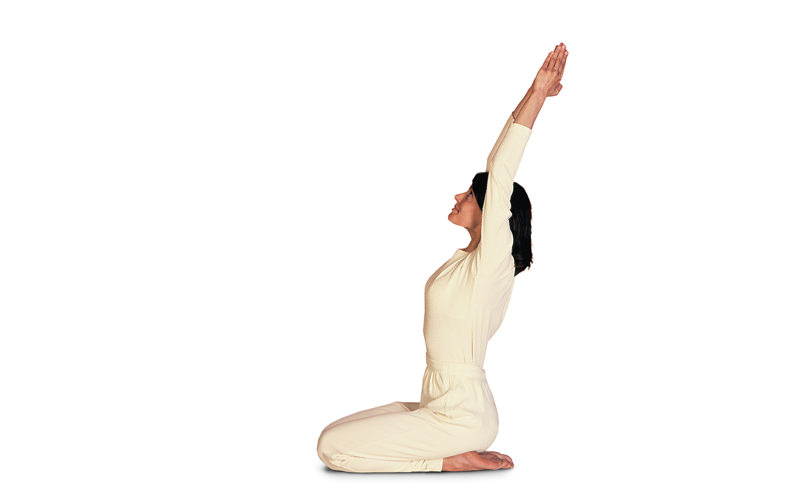 Raise both arms above the head. Place the palms together and look towards the hands.