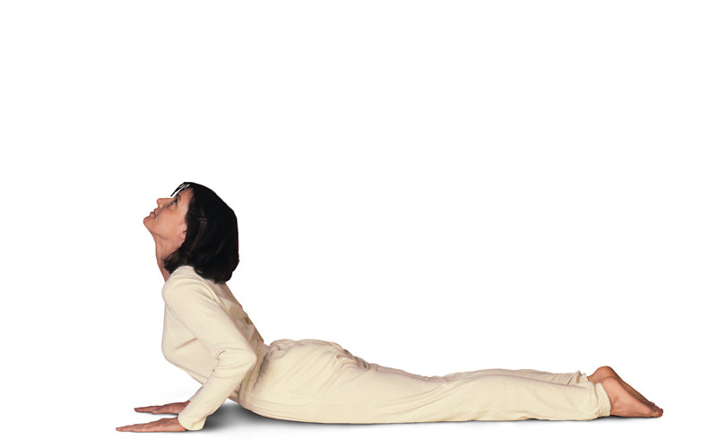 Lower the hips to the floor and raise the upper body with the help of the hands, but only to the degree that the hips remain in contact with the floor. Look upward, ensure the spine is evenly arched.