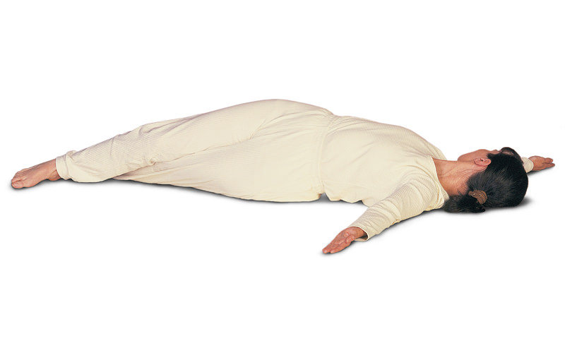 Lie relaxed on the back and stretch the arms out sideways at shoulder height. >Inhaling place the left heel between the big toe and the second toe of the right foot. The legs are straight. >Exhaling roll both feet to the right until they touch the floor and at the same time turn the head to the left. Arms and shoulders remain in contact with the floor. >Inhaling return to the centre. Repeat this movement 3 times. >Change the position of the feet and practice the twist 3 times to the other side. >Return to the starting position. Direct the attention to the slow, continuous practice of the twist in harmony with the breath, and to the simultaneous twisting of the head and the legs in opposite directions.