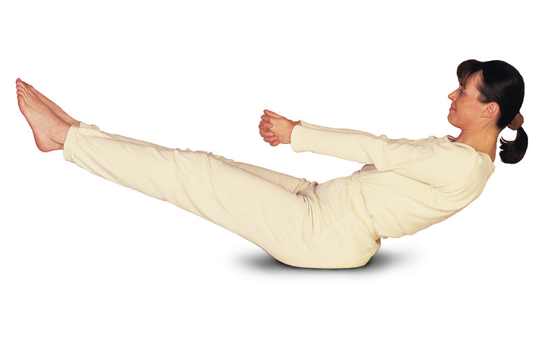 Sit with legs straight. Stretch the arms to the front and clasp the fingers. Raise the legs and lean the upper body slightly backwards. Balance on the buttocks so the body looks like a boat. >Breathe normally, rocking the body 10 times to the left and to the right. Then return to the starting position.
