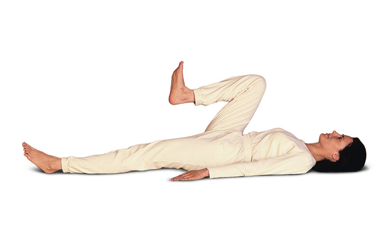 Breathing normally raise the right leg and make a bicycling movement, keeping the ankle flexed. Slowly draw circles as large as possible with the leg. Cycle 10 times forwards and 10 times backwards. Repeat the exercise with the other leg. Return to the starting position.