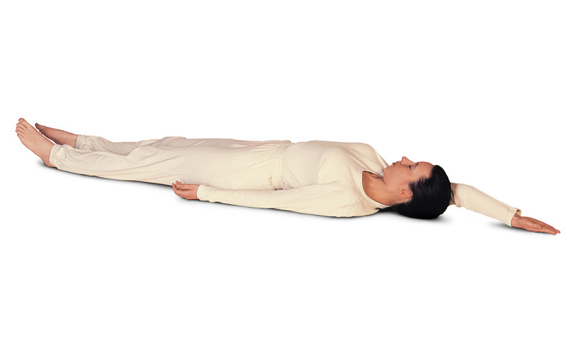 >Inhaling raise both arms above the head. Stretch the whole body as hands and heels extend in opposite directions. At the same time press the hips and lower back downwards.>Exhaling return to the starting position and relax. Practice the exercise 3 times.
