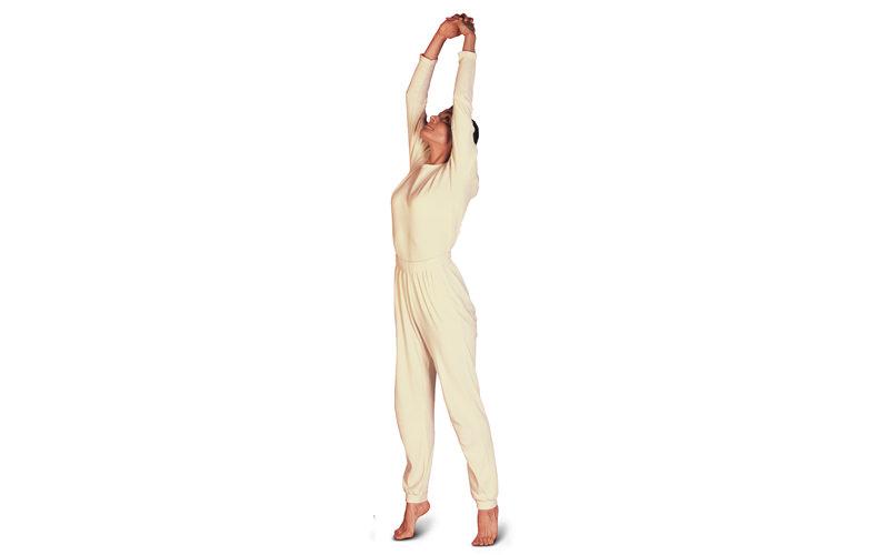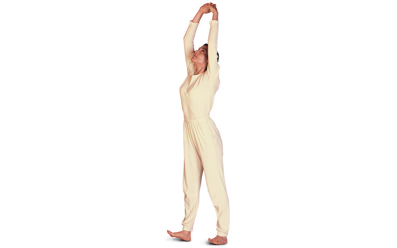 Stand erect and relaxed. Clasp the fingers. >Inhaling raise the arms above the head and stretch through the whole body. Look towards the hands. Breathing normally take 50 steps on the heels and 50 steps on the toes.