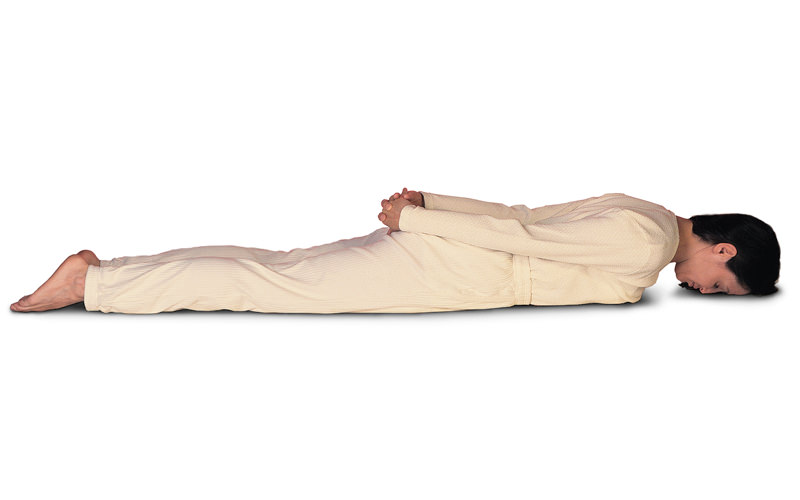 Remain lying on the abdomen with arms stretched out in front. Place the chin or forehead on the floor. The feet are flat on the floor. >Inhaling deeply bring the hands in a wide arc behind the back and clasp the fingers. >Exhaling deeply, return to the starting position.