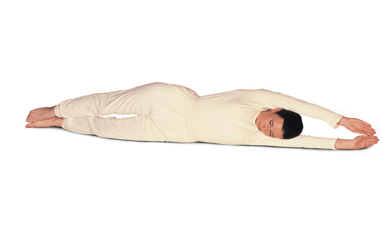 Lie relaxed on the back.>Inhaling stretch the arms above the head until they rest on the floor. >Breathing normally, keep the body straight and roll onto the left side and then the right side. Return to the starting position. Repeat the exercise 3 times.