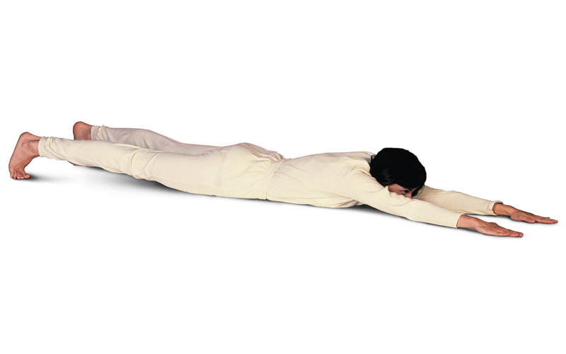 Lie on the abdomen with the arms stretched out to the front. Place the chin or forehead on the floor and tuck the toes under. >Inhaling stretch the body so the hands and heels stretch in opposite directions. During the stretch the knees rise slightly from the floor. >Exhaling relax. After 5 stretching movements return to the starting position.