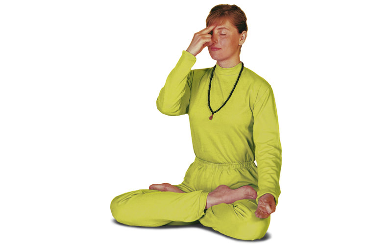 Concentrate for 3-5 minutes on your normal breath. Sit comfortably, spine upright, then raise the right hand to Pranayama Mudra. >Close the right nostril with the thumb and inhale through the left nostril slightly deeper than normal. >Open the right nostril, at the same time closing the left nostril with the ring finger. Exhale slowly and gently through the right nostril. >Perform 20 rounds of this alternate nostril breathing. >Return the hand to the knee and concentrate for 2-3 minutes on the normal breath. >Again raise the right hand to Pranayama Mudra. >Close the left nostril with the right ring finger and inhale deeply through the right nostril. >Open the left nostril, at the same time closing the right nostril with the thumb. Slowly exhale through the left. >Perform 20 rounds of this alternate nostril breathing. >Return the hand to the knee and concentrate for 3-5 minutes on the normal breath.