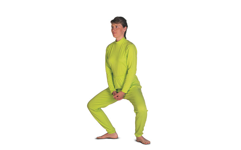 Stand with legs apart, toes pointing outward. Clasp the fingers in front of the body. >Inhale deeply. >Exhaling bend the knees sideways over the toes. The upper body remains straight. >Inhaling stand upright, keeping the back straight.