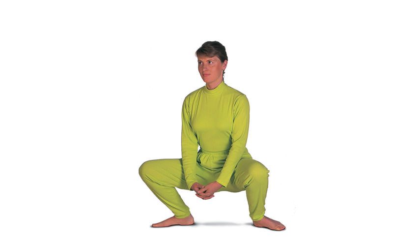 The exercise is practised in three stages. With the first squatting movement the hands should reach thigh level. With the second, knee level, and with the third, calf level. During the squatting movement the trunk of the body should always remain upright.