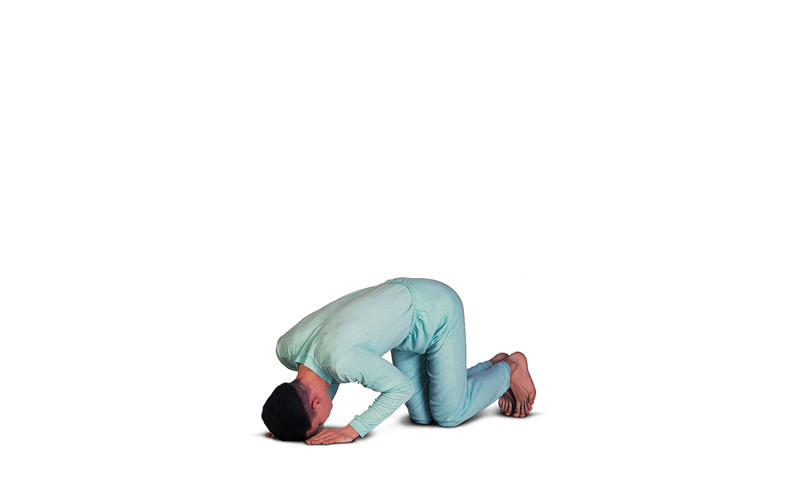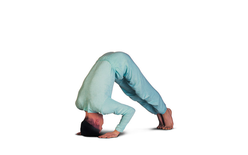 Sit in Vajrasana. >Inhaling come up onto the knees. >Exhaling place the hands and top of the head on the floor. >Inhaling tuck the toes under and straighten the legs. Maintaining balance, clasp the fingers behind the back. >Breathing normally remain in this position as long as comfortable. >Exhaling return hands and knees to the floor. >Inhaling return to the starting position.