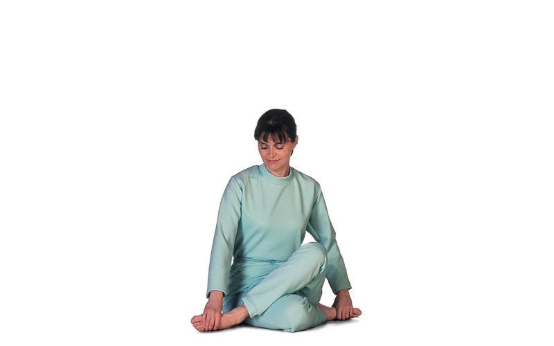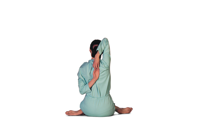 Sit with the legs straight. Bend the left leg and place it over the right thigh so that the left heel touches the outer side of the right buttock. Bend the right leg and place the right heel beside the left buttock. Both buttocks remain on the floor. >Raise the right arm and bend it behind the head so the elbow points up. Bring the left arm behind the back from below and clasp the fingers of both hands together. The head remains upright and straight and rests on the right forearm. Look up. >Breathing normally hold the position. Return to the starting position.