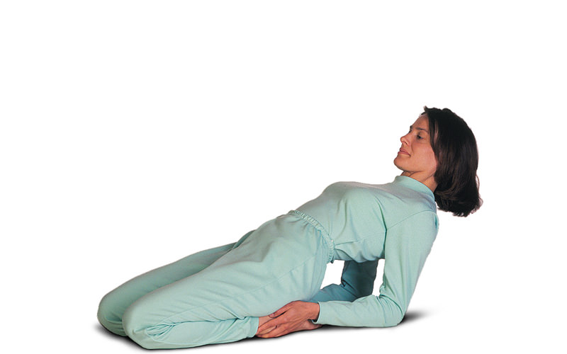 Sit in Vajrasana with heels pointing outwards and big toes touching. The body is upright, hands rest on the thighs. Relax the whole body. >Breathing normally place the hands on the floor beside the buttocks. Bend the elbows and slowly lean the body back until the elbows rest on the floor. Lower the head backward until the top of the head touches the floor. Bring palms together in front of the chest and hold the posture. >Breathing is relaxed and slightly deeper than normal, inhaling through the nose and exhaling through the mouth. >With the help of the elbows slowly return to the starting position.