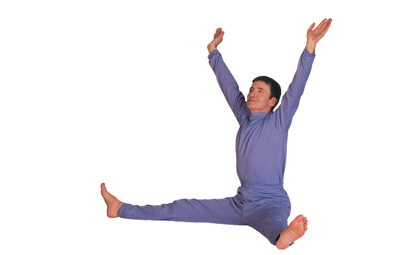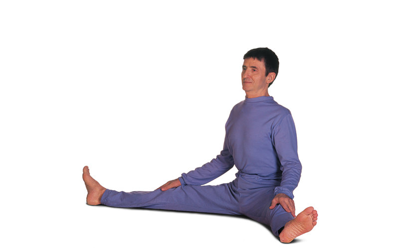 Sit with legs straight and wide apart. Hands rest on the thighs. >Inhaling raise both arms above the head. >Exhaling bend forward from the hips, keep the back as straight as possible and grasp the toes. Pull the upper body even further forward until the forehead touches the floor. The legs remain straight. >Breathing normally hold this position. >Inhaling bring the body upright keeping the arms straight. >Exhaling place the hands on the thighs.