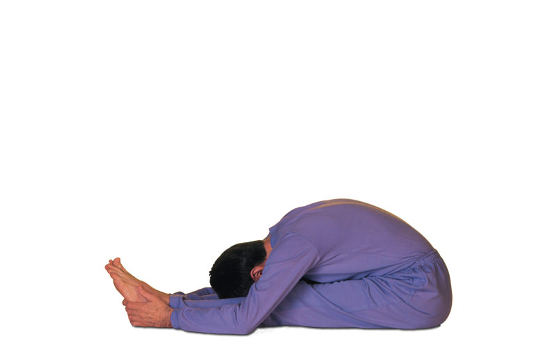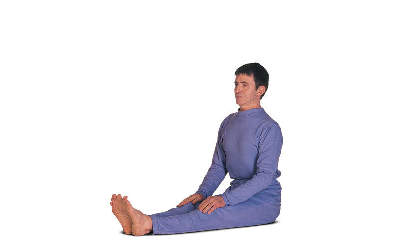 Sit with the legs straight. The hands rest on the thighs. >Inhaling keep the arms straight and raise them above the head. >Exhaling, keep the back straight, bend forward from the hips as far as possible and hold the toes. Knees remain straight. Try to bring the head forward to touch the knees. >Breathing normally hold this position. >Inhaling bring the body upright keeping the arms straight. >Exhaling place the hands on the thighs.