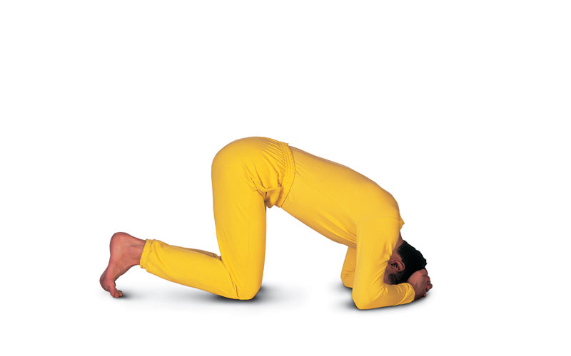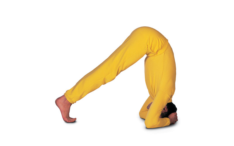 Sit in Vajrasana. Hands rest on the thighs. >Breathing normally place the head on the floor in front of the knees. Clasp the fingers behind the head and support the back of the head with the clasped hands. The forearms rest on the floor and the elbows form an equilateral triangle with the head. >Tuck the toes under, lift the hips and straighten the legs. Concentrate on the balance of the body. Walk the feet in closer to the body so that the buttocks are high above the head. Transfer the weight of the body onto the forearms and raise the feet from the floor. Keeping the back straight bring the heels towards the buttocks. Finally, straighten the legs fully upright and allow the feet to remain relaxed. Balance the body weight between forearms, head and neck in a relaxed manner. >Hold the posture as long as possible, but not more than five minutes. >Slowly lower the legs by bending the knees and bringing the feet towards the buttocks and then the toes to the floor. >Relax forward for some time in Yoga Mudra and then return to Vajrasana.