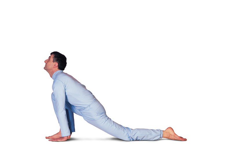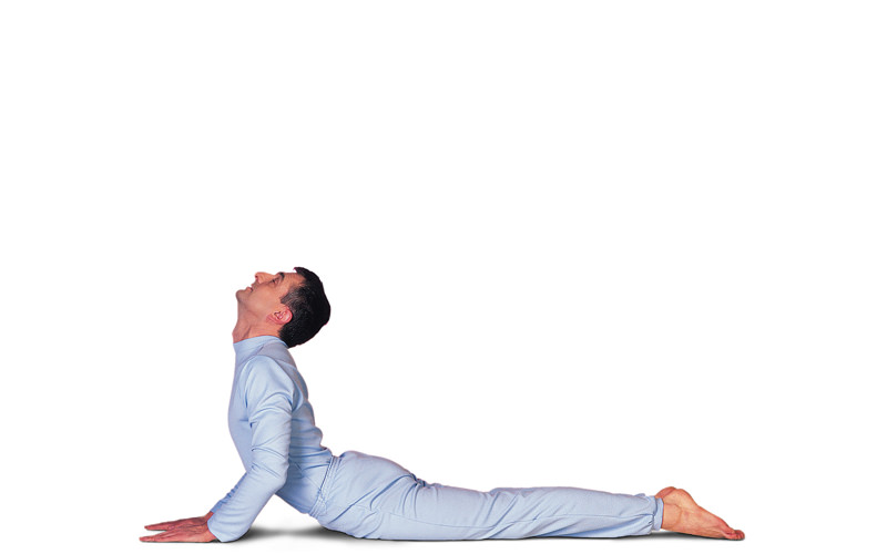 Holding the breath lower the hips to the floor and with the help of the hands lift the body up (Bhujangasana). The shoulders are pressed down and back. Stretch not only through the lumbar spine but also through the thoracic spine, so that the whole of the spine is evenly arched. The feet rest flat on the floor. Straighten the arms only to the degree that the hips can remain in contact with the floor. Look up.