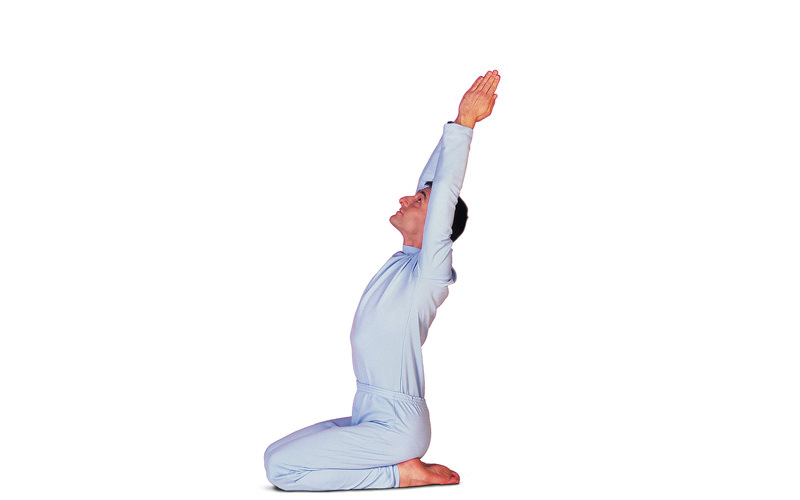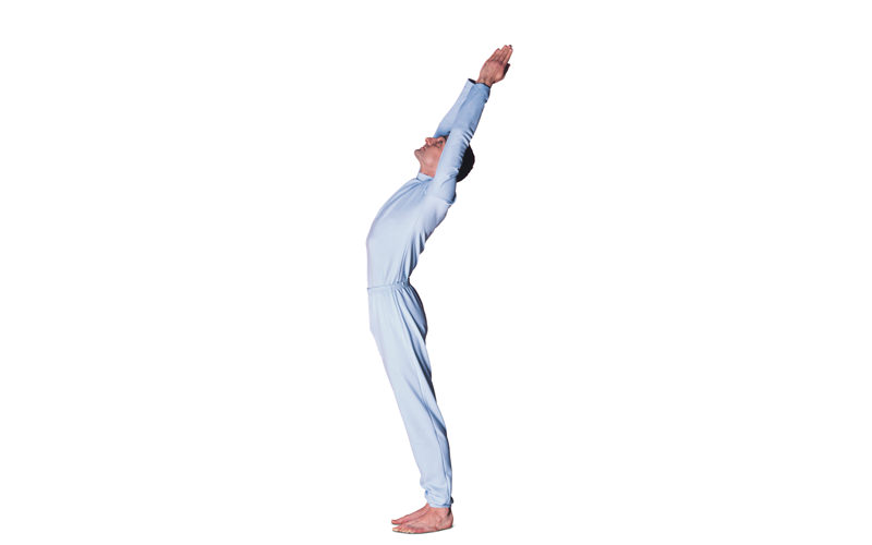 Inhaling raise the body with the arms extended above the head. Bring the palms together and stretch the whole body up and slightly back. Look towards the hands. The back is evenly extended.