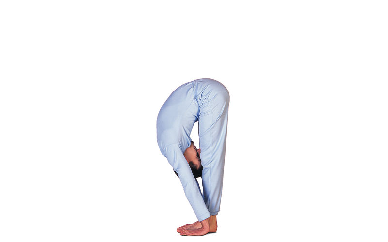 Holding the breath bring the left foot beside the right and straighten the knees. Allow the upper body to hang forward completely relaxed. If it is possible, place the palms of the hands on the floor.