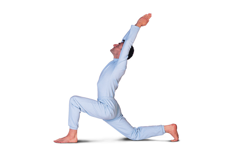 Inhaling step back with the right foot, lower the right knee to the floor and look up, as in Position 6.