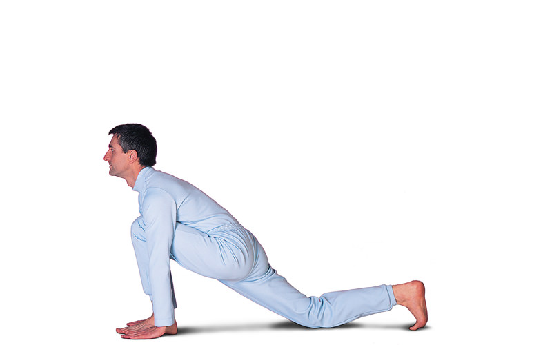 Inhaling step the right foot between the hands and lower the left knee to the floor. The toes of the left foot can be tucked under or lie flat on the floor. Raise the head and look up. The palms or fingers touch the floor. The right side of the abdomen and chest rest on the right thigh.
