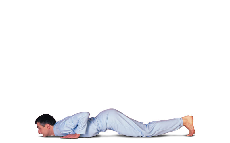 Exhaling place chin and chest on the floor and raise the buttocks, as in Position 3.