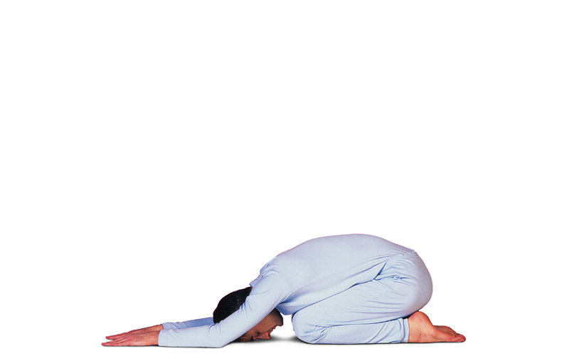 Exhaling turn the palms to the front. Keeping the back and arms straight, bend forward from the hips until the arms and forehead touch the floor (Shashankasana).
