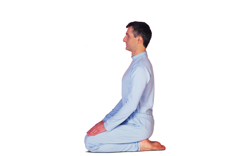 Sit in Vajrasana. The body is erect, hands rest on the thighs. Back, neck and head form a straight line. Relax the whole body.