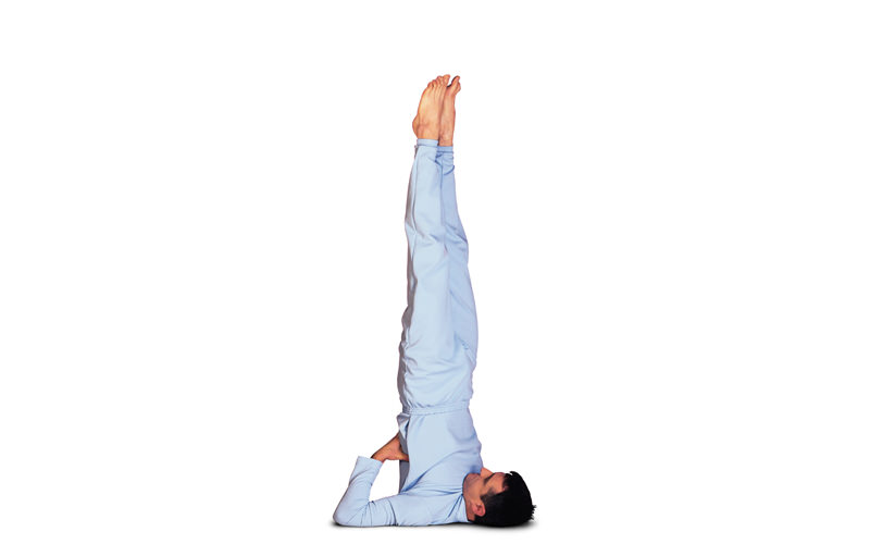 Come into Sarvangasana and remain for some time in this position. Observe the breath in the Vishuddhi Chakra. >Bend the knees and allow the lower legs to hang down relaxed. The thighs and back remain in a vertical line. Hold the position for some time and then return to Sarvangasana. >Slowly lower the legs and back and relax lying on the back. >Practice Matsyasana as a counterpose.