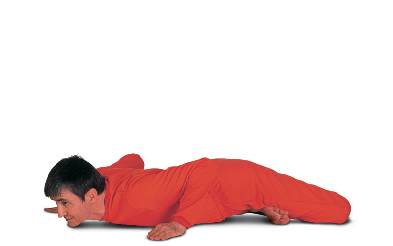 Sit in Padmasana. >With the help of the hands come up onto the knees and slowly lower down onto the abdomen. Place the chin on the floor. Bring the arms behind the back and place the palms together with the fingers pointing towards the head. >Lie completely flat on the floor and try to relax the whole body. Breathe quietly and gently and hold this position for some time. >Slowly return to the starting position.