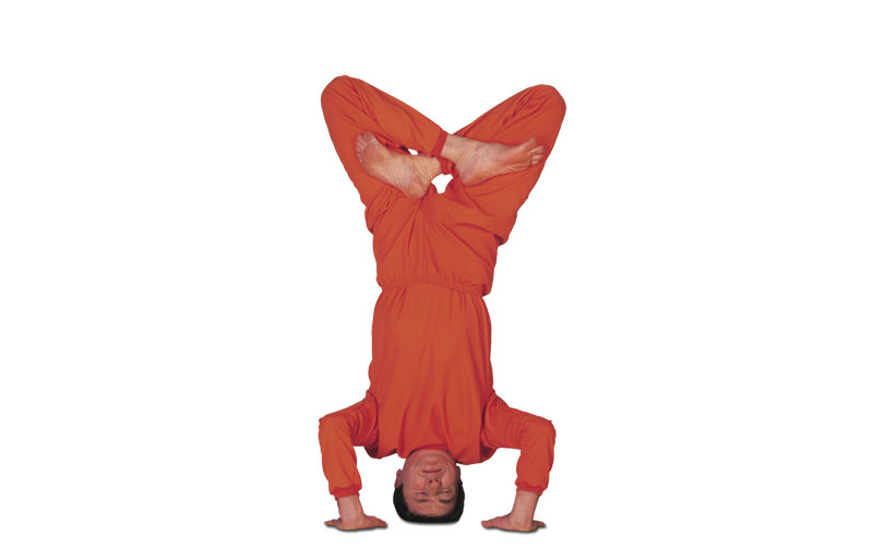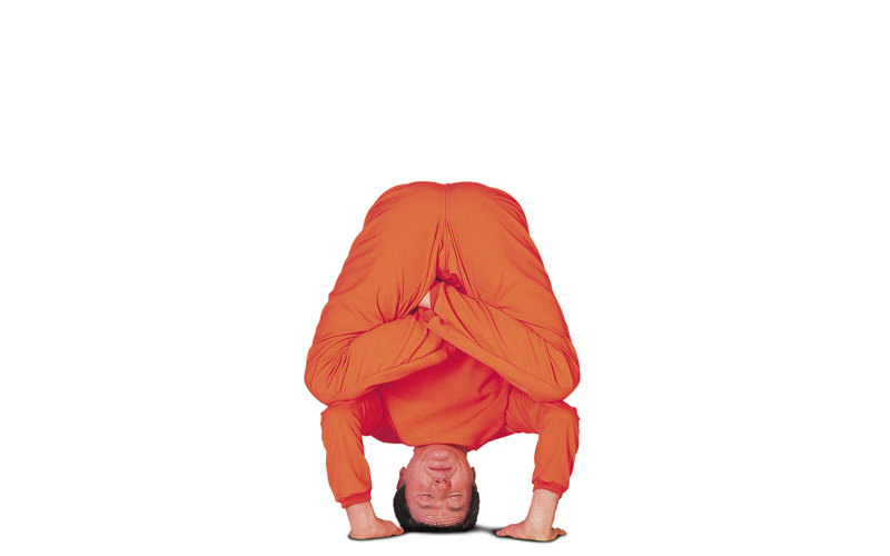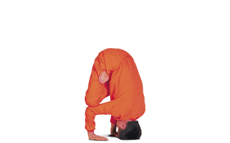 Come into Padmasana. With the help of the hands slowly come up onto the knees. Place the hands on the floor in front of the body. The fingers are spread and point forwards. >Slowly bend the upper body forward until the head touches the floor and forms an equilateral triangle with the hands. >Raise the buttocks high and bring the knees to rest on the elbows. Hold the position and concentrate on the balance. >Now raise the legs so that the knees point up and the body weight is carried on the head and the hands. Afterwards return to the starting position.